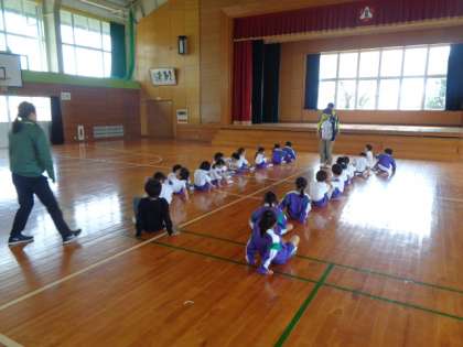 きれいに並んでいるのは、このあといろんな合図で左右に分かれて、追いかけられる側・つかまえる側に別れる鬼ごっこが行われるためです。どんな合図が出るか、わくわくして先生の話を聞いています。