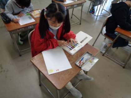 図画工作科として、自分だけのオリジナルのマークを作っていました。完成した何種類かのマークをシール用のシートに印刷して、振り返りカードやめあてカードに活用していくのだとか。