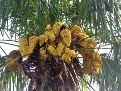 中の画像 シュロの木が花を咲かせました。シュロの木は雄雌があります。この花の形状から、この木はオスの木だということが分かりました。