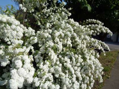 下の画像 コデマリの花が満開です。細い枝や葉が見えなくなるほど白い多数の花を咲かせており、見事です。