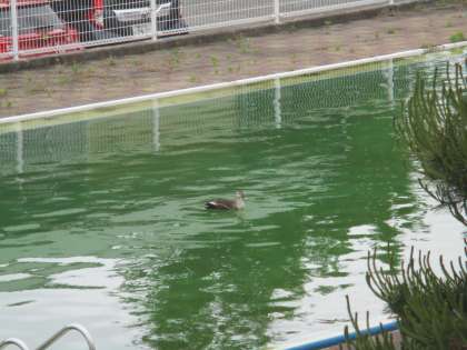 (今日もプールでは鴨が気持ちよく羽根休めをしていました。子供たちによると、つがいで来る日もあれば、親子で飛来する日もあるとか。子供たちも日々の様子を楽しみに観察してるようです。)