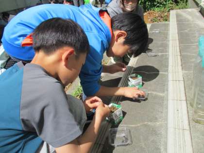 牛乳パックの空き箱を栽培ポットにして、タネの植え付けを楽しんでいました。