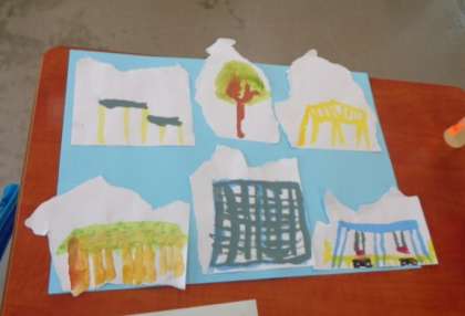 まず画用紙を破いて、破いたあとの形から学校の中の「お気に入り」を見つけて描く、というとてもユニークな題材です。