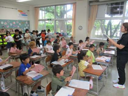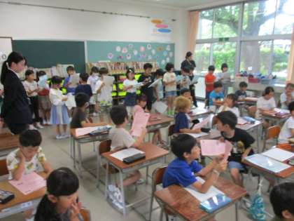 画像は、1年生教室に2年生に来てもらい、合同で楽しい遠足にするためのお話しを聞いている様子です。