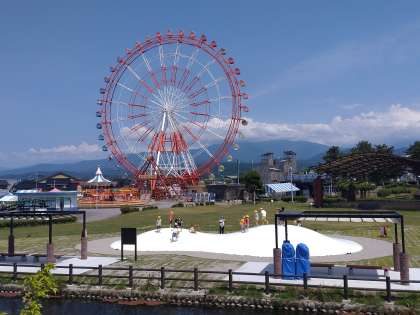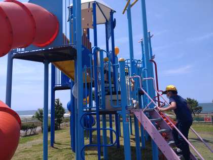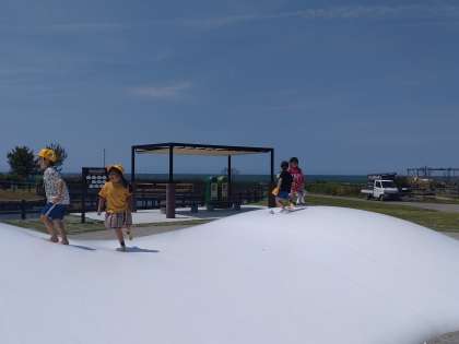 乗り物のチケットを使い切ったグループは、こちらに移動し、力一杯遊んでいます。気温は30度を超えていますが、海風が涼しく心地よいです。