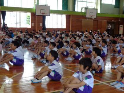 プール開きを行いました。あいにく水温が適正な温度に達しなかったため、体育館での実施となりました。