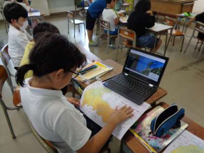 「主要交通機関、道路に着目して、富山市の地図をつくろう」という課題のもと、グループ活動を行ってます。副読本やGoogleMapを活用して、「自分たちらしさ」を検討していました。