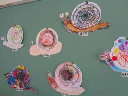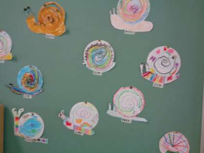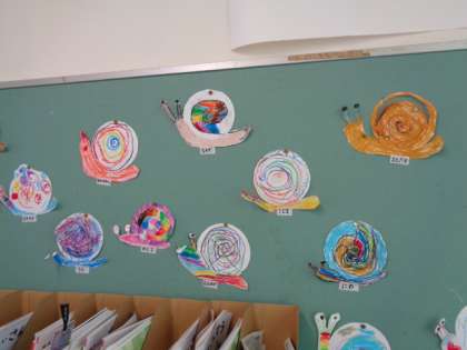 久しぶりに1年生教室を覗くと、カラフルなカタツムリが壁を行進していました。本日持ち帰るそうです。