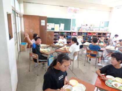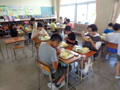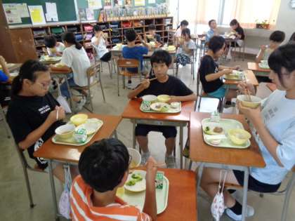 高学年教室では、以前までの一斉に前を向いての食事から、向き合っての会食形式に戻しています。