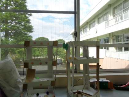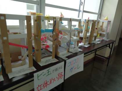 もしお時間が許せば、お子さんの作品を見つけていただき、ぜひ、ビー玉を頂上から転がしてみてくださいね。