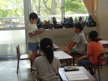 夏休みで心に残ったことをスピーチにまとめ、報告会を開いていました。