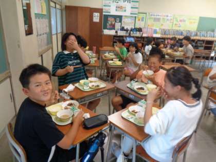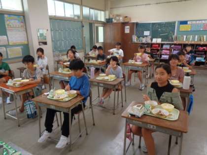 高学年は会食形式に戻し、和気あいあいと楽しそうに食べています。