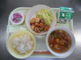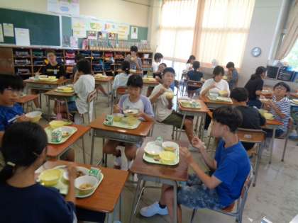 高学年は会食形式に戻し、和気あいあいと楽しそうに食べています。