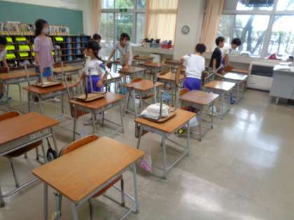 そうじロッカーには、「そうじ分担シート」がこの9月から貼られていて、しっかり役割分担が明示されています。これは清掃担当教諭のひと工夫です。