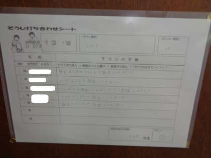 そうじロッカーには、「そうじ分担シート」がこの9月から貼られていて、しっかり役割分担が明示されています。これは清掃担当教諭のひと工夫です。