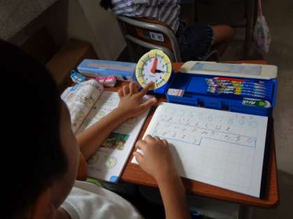 時刻の学習を行っています。どの子にも時間の概念が理解できるように、操作活動を生かして授業を進めています。