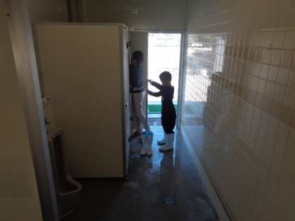 トイレ掃除は、他の場所よりもたくさん工程があるのですが、たった2人で黙々とこなしていました。しかも今日は水まきも加えたそうじをしています。
