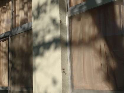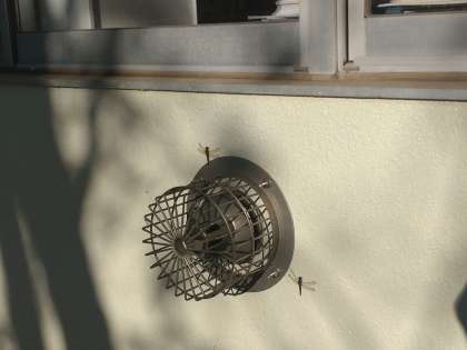朝、校舎の南側の陽だまりには、つがいになったアキアカネがたくさん行き交い、校舎の壁にたくさんとまっていました。