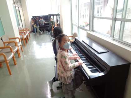 人気の岡童ストリートピアノのまわりには、今日も子供たちが楽しそうに演奏に興じています。