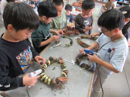 公園や学校で集めた秋の材料を、デザインを考えながら飾り付けていきました。