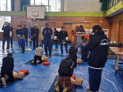本校でも屋上からの救出訓練、ドクターヘリ訓練といった訓練の見学だけでなく、起震車やはしご車の試乗や救命体験といった体験をすることができました。小雨が降る中でしたが、たくさんの地域の方と一緒に子供たちも参加し、体験することができました。