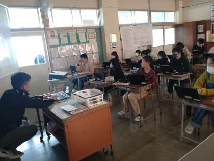 最後の体育館練習を終えて、教室にもどり、さっそく練習動画を見て、チャットスペースを活用して全員で最終検討をしていました。