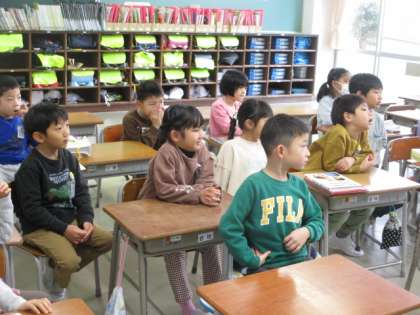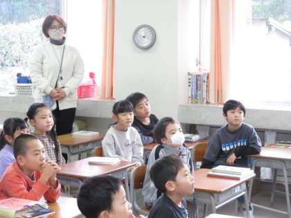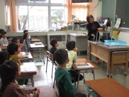 絵本の大きい絵に、図書ボランティアさんの読み手を引き込む読み方に、1年生の子供たちは目を輝かせて聞き入っていました。