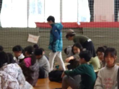 上、中の画像・・・服についた雪で濡れてしまった床面を、ボランティアで拭いている子たち。