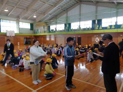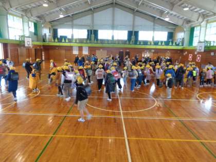 まず、通常の訓練の学年ごと避難の完了を確かめたのちに、引き渡しに備えた二次避難の仕方を訓練しています。