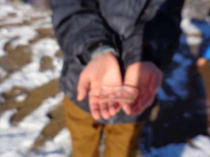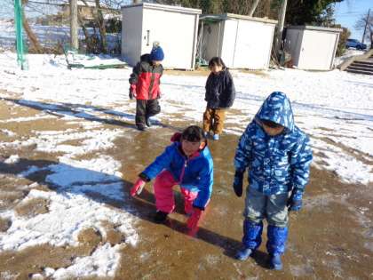 「氷と遊ぼう」グラウンドには10cmを超える氷があちこちに張っていました。スケートのように滑ったり回ったり、転ぶことも楽しんだり・・・。充実の冬の遊びとなりました。