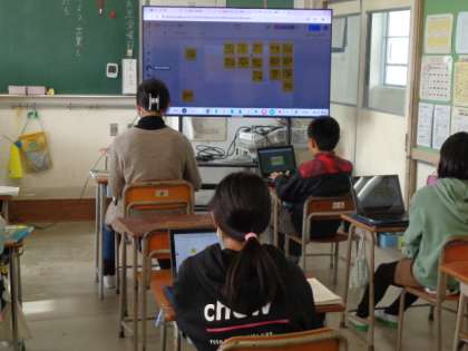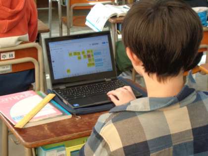 いろんな身近な言葉が集まり、その中から自分の主張を見いだそうと、友達の見方や考え方を参照しています。