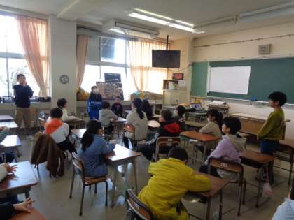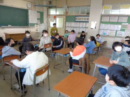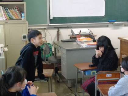 相手にかける「ほめ言葉」の表現について、これまで学んだり互いに使い方を確かめ合って作成した掲示を見ながら表現の練習をしています。