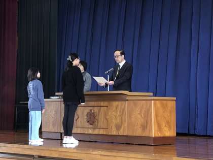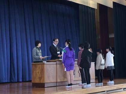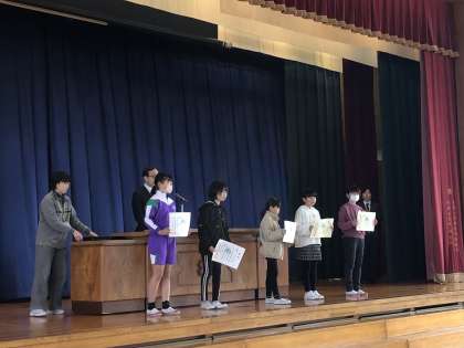 県の書き初め大会・図画コンクール・自然に関する作文・少女バレーボール大会などの伝達授賞を行いました。