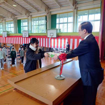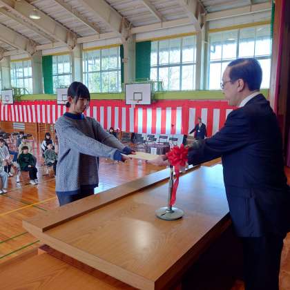代表児童に修了証を、6年間一度も休まなかった子、この1年間休まなかった子にそれぞれ皆勤賞を手渡しました。