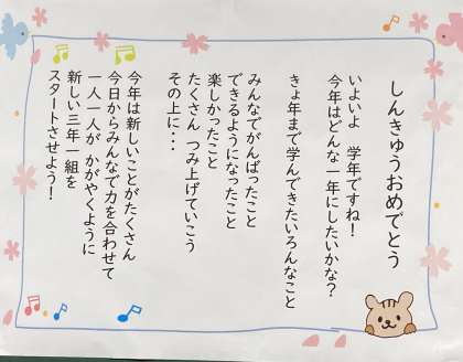 いよいよ明日新学期です。教室の準備も整いました。さて、どのクラスのメッセージでしょう?予想してみてください。