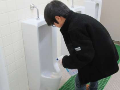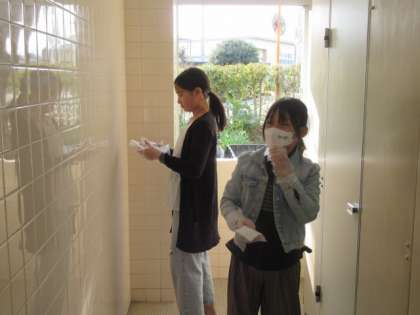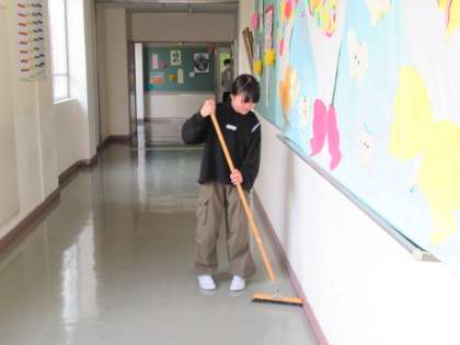 すみずみまで掃除しています。学校のために働く高学年。やる気満々です。