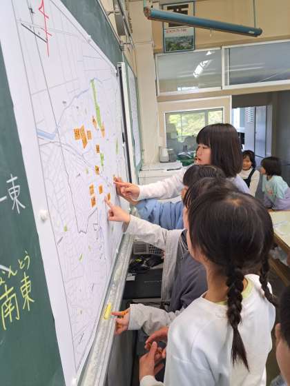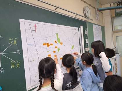 社会科の学習で学校のまわりのことを調べています。今日は、校区地図の中で自分の家の場所を探しました。