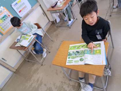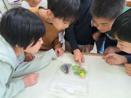数時間後、もう1匹卵からかえり、殻を食べている様子をみることができました。「かわいい!」「飛び立つ時は泣いてしまいそう」と、モンシロチョウの成長に心を寄せている3年生です。