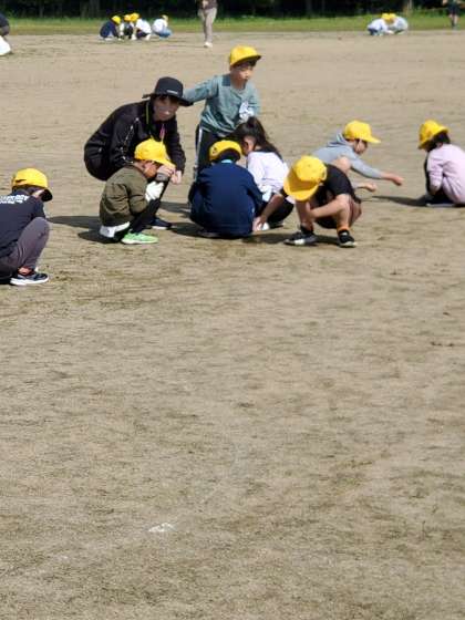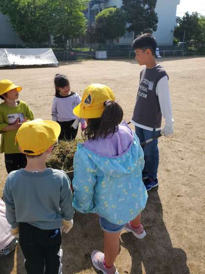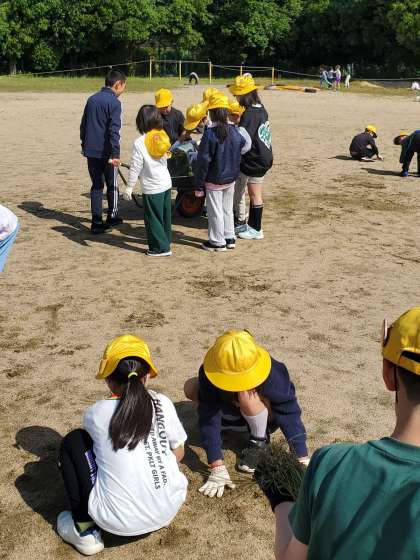 明日の運動会に向けて、朝から全校でグラウンド整備をしました。