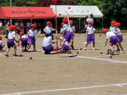 ダンシング玉入れ。今年のダンスは 「パジャマパーティーズ」。ちいかわの挿入歌です。1・2年生のダンスに保護者席から「かわいい!!」というつぶやきが聞こえました。
