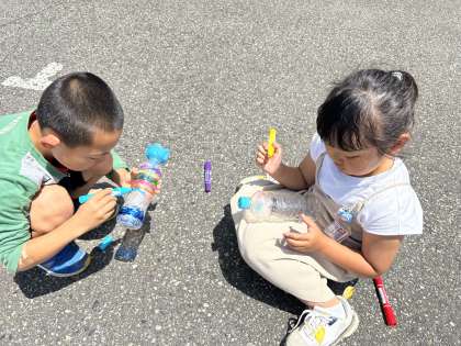 図画工作科の学習で、「ひかりのプレゼント」という作品を作りました。光を通す透明な材料(ペットボトル)に、油性ペンで色を付けました。「どんな色や形が映るかな?」「きれいな模様にするにはどうすればいいかな?」と考えたり、友達の良いところを真似したりして活動に取り組みました。