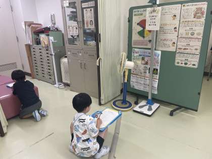 探検で見つけたことはワークシートにどんどん書き込んでいきます。習いたての文字を使う子、得意の絵で表現する子、どの子も真剣です。