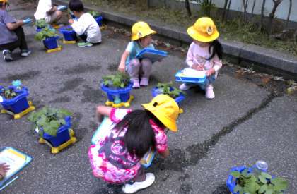 アサガオの観察をしました。最初は少なかった葉もだんだん増え、土が見えなくなるくらいに大きくなってきました。子どもたちは、葉の大きさを自分の手や指と比べ、アサガオがぐんぐん大きくなっていることに喜びを感じていました。