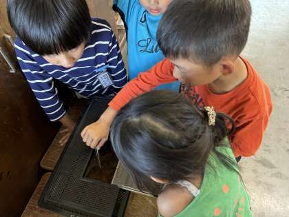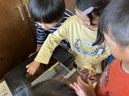 本日、3年生は校外学習に出かけおり、2年生は、太陽の時間や昼休み等に見に行っていた「ホクリクサンショウウオ」のお世話を任されました。慎重に餌をあげたり、興味津々に観察したりする姿が見られました。