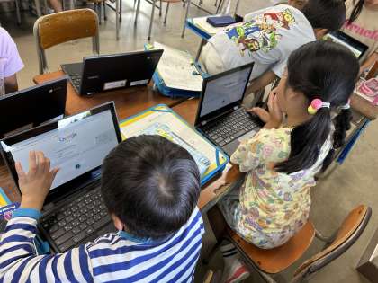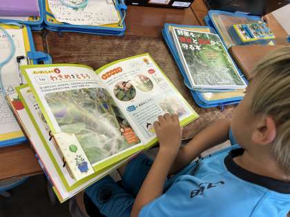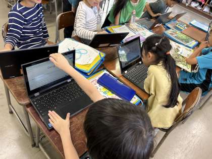 子供たちからは、「うどんこ病ってどうやったら治るんだろう。」「この黒い点はなんだろう?」と観察をする中で、様々な疑問の声があがっていました。この疑問を解決しようと、同じ野菜を育てている友達とともに、クロムブックや本を活用して病気であることを知り、その対策を真剣な眼差しで調べていました。