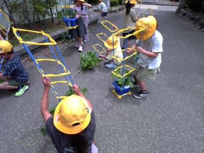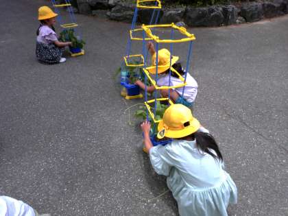 アサガオの鉢に支柱を立てました。葉がとても大きくなり、つるもぐんぐん伸びています。子どもたちは、アサガオをもっと大きくするために、愛情をこめてお世話をしています。