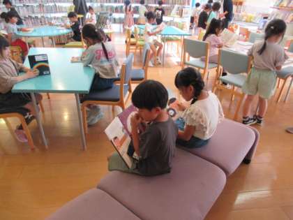 大島絵本館とこどもみらい館に行きました。大島絵本館では、シアターでビデオを見たり、仕掛け絵本や大きな絵本など、様々な絵本を読んだりしました。こどもみらい館では、弁当を食べたあとに、館内アスレチックで遊びました。どの活動も班の友達と声をかけあいながら楽しく過ごしていました。