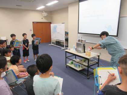はじめは流杉浄水場での学習です。職員の方が、どのように水をきれいにしているのか分かりやすく説明してくださいました。子供たちは熱心にメモをしていました。
