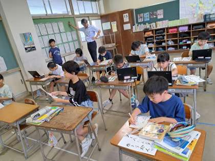 書写の時間に、初めて小筆を使いました。「夏を感じる言葉」をテーマに、思い思いに言葉を選んで書きました。