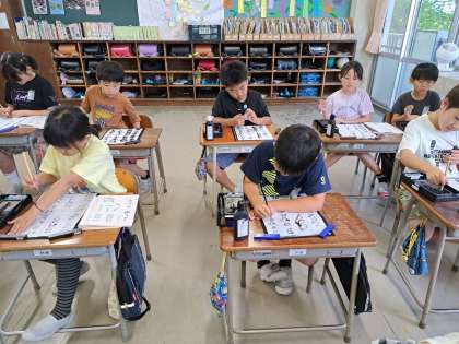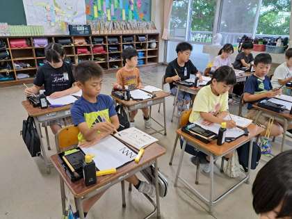 書写の時間に、初めて小筆を使いました。「夏を感じる言葉」をテーマに、思い思いに言葉を選んで書きました。
